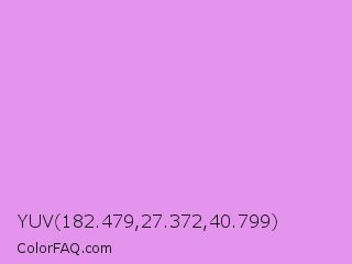 YUV 182.479,27.372,40.799 Color is a light magenta color and the nearest color is Bright Lilac #d891ef. Hex code #e594ee and RGB value is rgb(229,148,238). In RGB color space, this color is composed of 90% red, 58% green, 93% blue, In CMYK color space, this color is composed of 4% cyan, 38% magenta, 0% yellow , 7% black , In HSL color space, this color has a hue angle of 294° , 73% saturation and 76% lightness.