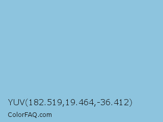 YUV 182.519,19.464,-36.412 Color is a light blue color and the nearest color is Dark Sky Blue #8cbed6. Hex code #8dc4de and RGB value is rgb(141,196,222). In RGB color space, this color is composed of 55% red, 77% green, 87% blue, In CMYK color space, this color is composed of 36% cyan, 12% magenta, 0% yellow , 13% black , In HSL color space, this color has a hue angle of 199° , 55% saturation and 71% lightness.
