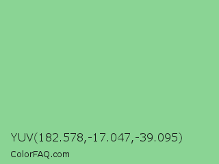 YUV 182.578,-17.047,-39.095 Color is a light green color and the nearest color is Eton Blue #96c8a2. Hex code #8ad494 and RGB value is rgb(138,212,148). In RGB color space, this color is composed of 54% red, 83% green, 58% blue, In CMYK color space, this color is composed of 35% cyan, 0% magenta, 30% yellow , 17% black , In HSL color space, this color has a hue angle of 128° , 46% saturation and 69% lightness.