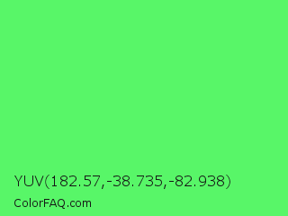 YUV 182.57,-38.735,-82.938 Color is a light green color and the nearest color is Screamin Green #66ff66. Hex code #58f668 and RGB value is rgb(88,246,104). In RGB color space, this color is composed of 35% red, 96% green, 41% blue, In CMYK color space, this color is composed of 64% cyan, 0% magenta, 58% yellow , 4% black , In HSL color space, this color has a hue angle of 126° , 90% saturation and 65% lightness.