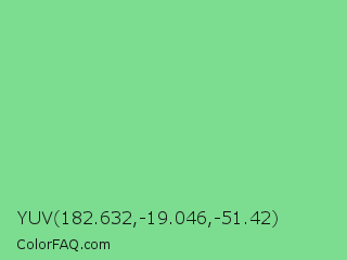 YUV 182.632,-19.046,-51.42 Color is a light green color and the nearest color is De York #7ac488. Hex code #7cdc90 and RGB value is rgb(124,220,144). In RGB color space, this color is composed of 49% red, 86% green, 56% blue, In CMYK color space, this color is composed of 44% cyan, 0% magenta, 35% yellow , 14% black , In HSL color space, this color has a hue angle of 133° , 58% saturation and 67% lightness.