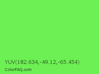 YUV 182.634,-49.12,-65.454 Color is a light green color and the nearest color is Screamin Green #66ff66. Hex code #6cf053 and RGB value is rgb(108,240,83). In RGB color space, this color is composed of 42% red, 94% green, 33% blue, In CMYK color space, this color is composed of 55% cyan, 0% magenta, 65% yellow , 6% black , In HSL color space, this color has a hue angle of 110° , 84% saturation and 63% lightness.