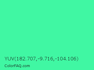YUV 182.707,-9.716,-104.106 Color is a light green color and the nearest color is Eucalyptus #44d7a8. Hex code #40f7a3 and RGB value is rgb(64,247,163). In RGB color space, this color is composed of 25% red, 97% green, 64% blue, In CMYK color space, this color is composed of 74% cyan, 0% magenta, 34% yellow , 3% black , In HSL color space, this color has a hue angle of 152° , 92% saturation and 61% lightness.
