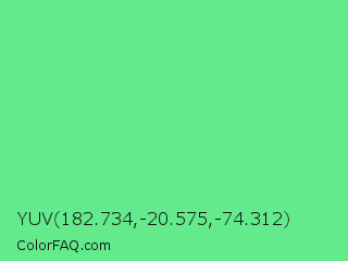 YUV 182.734,-20.575,-74.312 Color is a light green color and the nearest color is Very Light Malachite Green #64e986. Hex code #62ea8d and RGB value is rgb(98,234,141). In RGB color space, this color is composed of 38% red, 92% green, 55% blue, In CMYK color space, this color is composed of 58% cyan, 0% magenta, 40% yellow , 8% black , In HSL color space, this color has a hue angle of 139° , 76% saturation and 65% lightness.