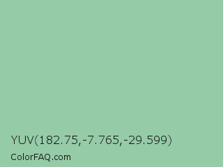 YUV 182.75,-7.765,-29.599 Color is a light green color and the nearest color is Eton Blue #96c8a2. Hex code #95cba7 and RGB value is rgb(149,203,167). In RGB color space, this color is composed of 58% red, 80% green, 65% blue, In CMYK color space, this color is composed of 27% cyan, 0% magenta, 18% yellow , 20% black , In HSL color space, this color has a hue angle of 140° , 34% saturation and 69% lightness.