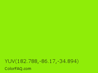 YUV 182.788,-86.17,-34.894 Color is a normal green color and the nearest color is Alien Armpit #84de02. Hex code #8fed08 and RGB value is rgb(143,237,8). In RGB color space, this color is composed of 56% red, 93% green, 3% blue, In CMYK color space, this color is composed of 40% cyan, 0% magenta, 97% yellow , 7% black , In HSL color space, this color has a hue angle of 85° , 93% saturation and 48% lightness.