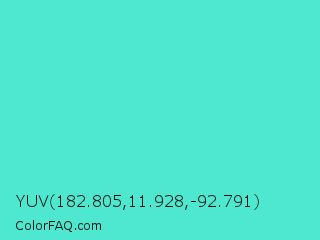 YUV 182.805,11.928,-92.791 Color is a light cyan color and the nearest color is Turquoise #40e0d0. Hex code #4de8cf and RGB value is rgb(77,232,207). In RGB color space, this color is composed of 30% red, 91% green, 81% blue, In CMYK color space, this color is composed of 67% cyan, 0% magenta, 11% yellow , 9% black , In HSL color space, this color has a hue angle of 170° , 77% saturation and 61% lightness.