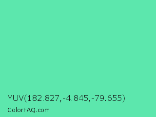 YUV 182.827,-4.845,-79.655 Color is a light green color and the nearest color is Medium Aquamarine #66ddaa. Hex code #5ce7ad and RGB value is rgb(92,231,173). In RGB color space, this color is composed of 36% red, 91% green, 68% blue, In CMYK color space, this color is composed of 60% cyan, 0% magenta, 25% yellow , 9% black , In HSL color space, this color has a hue angle of 155° , 74% saturation and 63% lightness.