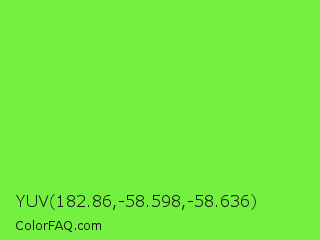 YUV 182.86,-58.598,-58.636 Color is a normal green color and the nearest color is Kiwi #8ee53f. Hex code #74f040 and RGB value is rgb(116,240,64). In RGB color space, this color is composed of 45% red, 94% green, 25% blue, In CMYK color space, this color is composed of 52% cyan, 0% magenta, 73% yellow , 6% black , In HSL color space, this color has a hue angle of 102° , 85% saturation and 60% lightness.