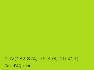 YUV 182.874,-76.353,-10.413 Color is a normal lime color and the nearest color is Inch Worm #b0e313. Hex code #abdb1c and RGB value is rgb(171,219,28). In RGB color space, this color is composed of 67% red, 86% green, 11% blue, In CMYK color space, this color is composed of 22% cyan, 0% magenta, 87% yellow , 14% black , In HSL color space, this color has a hue angle of 75° , 77% saturation and 48% lightness.