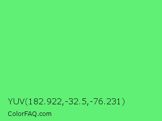 YUV 182.922,-32.5,-76.231 Color is a light green color and the nearest color is Very Light Malachite Green #64e986. Hex code #60f075 and RGB value is rgb(96,240,117). In RGB color space, this color is composed of 38% red, 94% green, 46% blue, In CMYK color space, this color is composed of 60% cyan, 0% magenta, 51% yellow , 6% black , In HSL color space, this color has a hue angle of 129° , 83% saturation and 66% lightness.