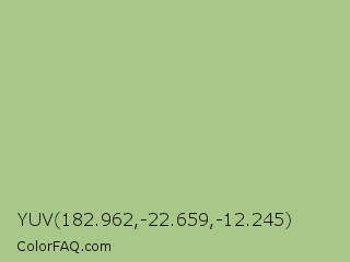 YUV 182.962,-22.659,-12.245 Color is a light green color and the nearest color is Swamp Green #acb78e. Hex code #a9c789 and RGB value is rgb(169,199,137). In RGB color space, this color is composed of 66% red, 78% green, 54% blue, In CMYK color space, this color is composed of 15% cyan, 0% magenta, 31% yellow , 22% black , In HSL color space, this color has a hue angle of 89° , 36% saturation and 66% lightness.