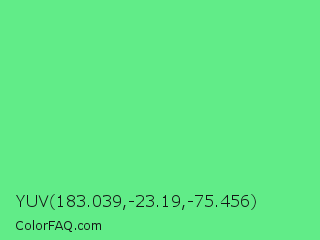 YUV 183.039,-23.19,-75.456 Color is a light green color and the nearest color is Very Light Malachite Green #64e986. Hex code #61ec88 and RGB value is rgb(97,236,136). In RGB color space, this color is composed of 38% red, 93% green, 53% blue, In CMYK color space, this color is composed of 59% cyan, 0% magenta, 42% yellow , 7% black , In HSL color space, this color has a hue angle of 137° , 79% saturation and 65% lightness.