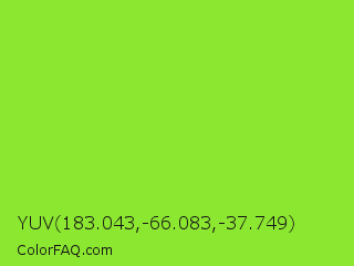 YUV 183.043,-66.083,-37.749 Color is a normal green color and the nearest color is Kiwi #8ee53f. Hex code #8ce731 and RGB value is rgb(140,231,49). In RGB color space, this color is composed of 55% red, 91% green, 19% blue, In CMYK color space, this color is composed of 39% cyan, 0% magenta, 79% yellow , 9% black , In HSL color space, this color has a hue angle of 90° , 79% saturation and 55% lightness.