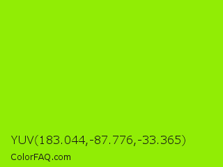 YUV 183.044,-87.776,-33.365 Color is a normal green color and the nearest color is Alien Armpit #84de02. Hex code #91ed05 and RGB value is rgb(145,237,5). In RGB color space, this color is composed of 57% red, 93% green, 2% blue, In CMYK color space, this color is composed of 39% cyan, 0% magenta, 98% yellow , 7% black , In HSL color space, this color has a hue angle of 84° , 96% saturation and 47% lightness.