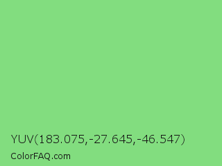 YUV 183.075,-27.645,-46.547 Color is a light green color and the nearest color is Pastel Green #77dd77. Hex code #82dd7f and RGB value is rgb(130,221,127). In RGB color space, this color is composed of 51% red, 87% green, 50% blue, In CMYK color space, this color is composed of 41% cyan, 0% magenta, 43% yellow , 13% black , In HSL color space, this color has a hue angle of 118° , 58% saturation and 68% lightness.