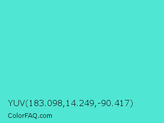 YUV 183.098,14.249,-90.417 Color is a light cyan color and the nearest color is Turquoise #40e0d0. Hex code #50e6d4 and RGB value is rgb(80,230,212). In RGB color space, this color is composed of 31% red, 90% green, 83% blue, In CMYK color space, this color is composed of 65% cyan, 0% magenta, 8% yellow , 10% black , In HSL color space, this color has a hue angle of 173° , 75% saturation and 61% lightness.
