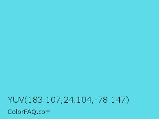 YUV 183.107,24.104,-78.147 Color is a light cyan color and the nearest color is Turquoise Blue #6cdae7. Hex code #5edbe8 and RGB value is rgb(94,219,232). In RGB color space, this color is composed of 37% red, 86% green, 91% blue, In CMYK color space, this color is composed of 59% cyan, 6% magenta, 0% yellow , 9% black , In HSL color space, this color has a hue angle of 186° , 75% saturation and 64% lightness.