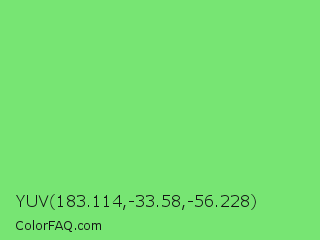 YUV 183.114,-33.58,-56.228 Color is a light green color and the nearest color is Pastel Green #77dd77. Hex code #77e573 and RGB value is rgb(119,229,115). In RGB color space, this color is composed of 47% red, 90% green, 45% blue, In CMYK color space, this color is composed of 48% cyan, 0% magenta, 50% yellow , 10% black , In HSL color space, this color has a hue angle of 118° , 69% saturation and 67% lightness.