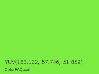 YUV 183.132,-57.746,-51.859 Color is a normal green color and the nearest color is Kiwi #8ee53f. Hex code #7cec42 and RGB value is rgb(124,236,66). In RGB color space, this color is composed of 49% red, 93% green, 26% blue, In CMYK color space, this color is composed of 47% cyan, 0% magenta, 72% yellow , 7% black , In HSL color space, this color has a hue angle of 100° , 82% saturation and 59% lightness.