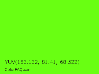YUV 183.132,-81.41,-68.522 Color is a normal green color and the nearest color is Bright Green #66ff00. Hex code #69ff12 and RGB value is rgb(105,255,18). In RGB color space, this color is composed of 41% red, 100% green, 7% blue, In CMYK color space, this color is composed of 59% cyan, 0% magenta, 93% yellow , 0% black , In HSL color space, this color has a hue angle of 98° , 100% saturation and 54% lightness.