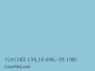 YUV 183.134,16.696,-35.198 Color is a light blue color and the nearest color is Dark Sky Blue #8cbed6. Hex code #8fc5d9 and RGB value is rgb(143,197,217). In RGB color space, this color is composed of 56% red, 77% green, 85% blue, In CMYK color space, this color is composed of 34% cyan, 9% magenta, 0% yellow , 15% black , In HSL color space, this color has a hue angle of 196° , 49% saturation and 71% lightness.