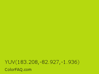 YUV 183.208,-82.927,-1.936 Color is a normal lime color and the nearest color is Fuego #bede0d. Hex code #b5d90f and RGB value is rgb(181,217,15). In RGB color space, this color is composed of 71% red, 85% green, 6% blue, In CMYK color space, this color is composed of 17% cyan, 0% magenta, 93% yellow , 15% black , In HSL color space, this color has a hue angle of 71° , 87% saturation and 45% lightness.