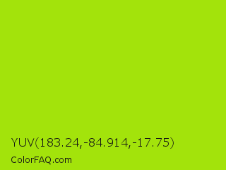 YUV 183.24,-84.914,-17.75 Color is a normal lime color and the nearest color is Vivid Lime Green #a6d608. Hex code #a3e30b and RGB value is rgb(163,227,11). In RGB color space, this color is composed of 64% red, 89% green, 4% blue, In CMYK color space, this color is composed of 28% cyan, 0% magenta, 95% yellow , 11% black , In HSL color space, this color has a hue angle of 78° , 91% saturation and 47% lightness.