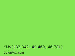 YUV 183.342,-49.469,-46.781 Color is a light green color and the nearest color is Kiwi #8ee53f. Hex code #82e653 and RGB value is rgb(130,230,83). In RGB color space, this color is composed of 51% red, 90% green, 33% blue, In CMYK color space, this color is composed of 43% cyan, 0% magenta, 64% yellow , 10% black , In HSL color space, this color has a hue angle of 101° , 75% saturation and 61% lightness.