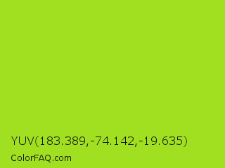 YUV 183.389,-74.142,-19.635 Color is a normal green color and the nearest color is Inch Worm #b0e313. Hex code #a1e021 and RGB value is rgb(161,224,33). In RGB color space, this color is composed of 63% red, 88% green, 13% blue, In CMYK color space, this color is composed of 28% cyan, 0% magenta, 85% yellow , 12% black , In HSL color space, this color has a hue angle of 80° , 75% saturation and 50% lightness.