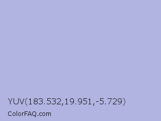 YUV 183.532,19.951,-5.729 Color is a light blue color and the nearest color is Maximum Blue Purple #acace6. Hex code #b1b3e0 and RGB value is rgb(177,179,224). In RGB color space, this color is composed of 69% red, 70% green, 88% blue, In CMYK color space, this color is composed of 21% cyan, 20% magenta, 0% yellow , 12% black , In HSL color space, this color has a hue angle of 237° , 43% saturation and 79% lightness.