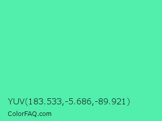 YUV 183.533,-5.686,-89.921 Color is a light green color and the nearest color is Eucalyptus #44d7a8. Hex code #51eeac and RGB value is rgb(81,238,172). In RGB color space, this color is composed of 32% red, 93% green, 67% blue, In CMYK color space, this color is composed of 66% cyan, 0% magenta, 28% yellow , 7% black , In HSL color space, this color has a hue angle of 155° , 82% saturation and 63% lightness.