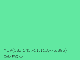 YUV 183.541,-11.113,-75.896 Color is a light green color and the nearest color is Medium Aquamarine #66ddaa. Hex code #61e8a1 and RGB value is rgb(97,232,161). In RGB color space, this color is composed of 38% red, 91% green, 63% blue, In CMYK color space, this color is composed of 58% cyan, 0% magenta, 31% yellow , 9% black , In HSL color space, this color has a hue angle of 148° , 75% saturation and 65% lightness.