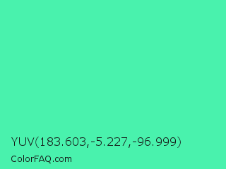 YUV 183.603,-5.227,-96.999 Color is a light green color and the nearest color is Eucalyptus #44d7a8. Hex code #49f2ad and RGB value is rgb(73,242,173). In RGB color space, this color is composed of 29% red, 95% green, 68% blue, In CMYK color space, this color is composed of 70% cyan, 0% magenta, 29% yellow , 5% black , In HSL color space, this color has a hue angle of 156° , 87% saturation and 62% lightness.