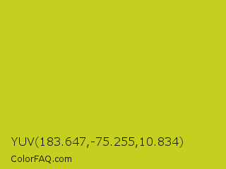 YUV 183.647,-75.255,10.834 Color is a normal yellow color and the nearest color is Key Lime Pie #bfc921. Hex code #c4cf1f and RGB value is rgb(196,207,31). In RGB color space, this color is composed of 77% red, 81% green, 12% blue, In CMYK color space, this color is composed of 5% cyan, 0% magenta, 85% yellow , 19% black , In HSL color space, this color has a hue angle of 64° , 74% saturation and 47% lightness.
