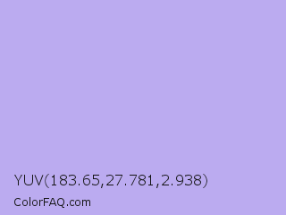 YUV 183.65,27.781,2.938 Color is a very light indigo color and the nearest color is Biloba Flower #b2a1ea. Hex code #bbabf0 and RGB value is rgb(187,171,240). In RGB color space, this color is composed of 73% red, 67% green, 94% blue, In CMYK color space, this color is composed of 22% cyan, 29% magenta, 0% yellow , 6% black , In HSL color space, this color has a hue angle of 254° , 70% saturation and 81% lightness.