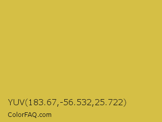YUV 183.67,-56.532,25.722 Color is a normal yellow color and the nearest color is Turmeric #cabb48. Hex code #d5bf45 and RGB value is rgb(213,191,69). In RGB color space, this color is composed of 84% red, 75% green, 27% blue, In CMYK color space, this color is composed of 0% cyan, 10% magenta, 68% yellow , 16% black , In HSL color space, this color has a hue angle of 51° , 63% saturation and 55% lightness.