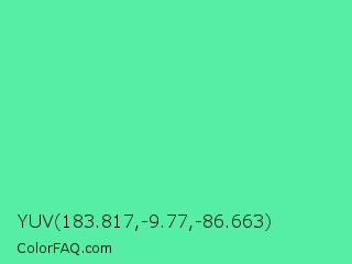 YUV 183.817,-9.77,-86.663 Color is a light green color and the nearest color is Medium Aquamarine #66ddaa. Hex code #55eea4 and RGB value is rgb(85,238,164). In RGB color space, this color is composed of 33% red, 93% green, 64% blue, In CMYK color space, this color is composed of 64% cyan, 0% magenta, 31% yellow , 7% black , In HSL color space, this color has a hue angle of 151° , 82% saturation and 63% lightness.