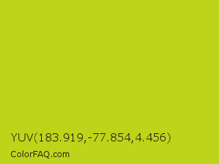 YUV 183.919,-77.854,4.456 Color is a normal yellow color and the nearest color is Key Lime Pie #bfc921. Hex code #bdd41a and RGB value is rgb(189,212,26). In RGB color space, this color is composed of 74% red, 83% green, 10% blue, In CMYK color space, this color is composed of 11% cyan, 0% magenta, 88% yellow , 17% black , In HSL color space, this color has a hue angle of 67° , 78% saturation and 47% lightness.