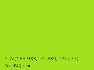 YUV 183.933,-75.889,-19.235 Color is a normal lime color and the nearest color is Inch Worm #b0e313. Hex code #a2e11e and RGB value is rgb(162,225,30). In RGB color space, this color is composed of 64% red, 88% green, 12% blue, In CMYK color space, this color is composed of 28% cyan, 0% magenta, 87% yellow , 12% black , In HSL color space, this color has a hue angle of 79° , 76% saturation and 50% lightness.