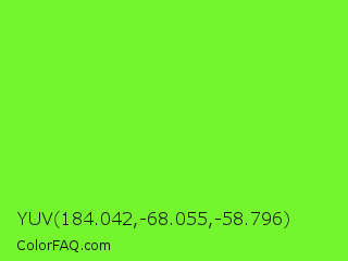 YUV 184.042,-68.055,-58.796 Color is a normal green color and the nearest color is Spring Frost #87ff2a. Hex code #75f52e and RGB value is rgb(117,245,46). In RGB color space, this color is composed of 46% red, 96% green, 18% blue, In CMYK color space, this color is composed of 52% cyan, 0% magenta, 81% yellow , 4% black , In HSL color space, this color has a hue angle of 99° , 91% saturation and 57% lightness.