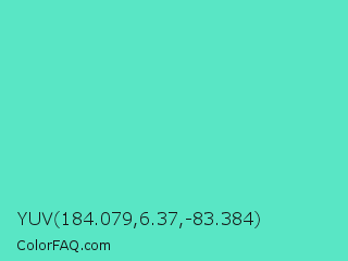 YUV 184.079,6.37,-83.384 Color is a light cyan color and the nearest color is Medium Turquoise #48d1cc. Hex code #59e6c5 and RGB value is rgb(89,230,197). In RGB color space, this color is composed of 35% red, 90% green, 77% blue, In CMYK color space, this color is composed of 61% cyan, 0% magenta, 14% yellow , 10% black , In HSL color space, this color has a hue angle of 166° , 74% saturation and 63% lightness.