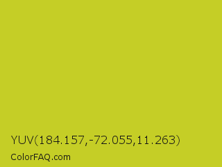 YUV 184.157,-72.055,11.263 Color is a normal yellow color and the nearest color is Key Lime Pie #bfc921. Hex code #c5ce26 and RGB value is rgb(197,206,38). In RGB color space, this color is composed of 77% red, 81% green, 15% blue, In CMYK color space, this color is composed of 4% cyan, 0% magenta, 82% yellow , 19% black , In HSL color space, this color has a hue angle of 63° , 69% saturation and 48% lightness.