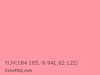 YUV 184.165,-9.941,62.122 Color is a light red color and the nearest color is Pink Salmon #ff91a4. Hex code #ff98a4 and RGB value is rgb(255,152,164). In RGB color space, this color is composed of 100% red, 60% green, 64% blue, In CMYK color space, this color is composed of 0% cyan, 40% magenta, 36% yellow , 0% black , In HSL color space, this color has a hue angle of 353° , 100% saturation and 80% lightness.