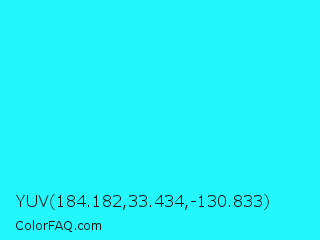 YUV 184.182,33.434,-130.833 Color is a normal cyan color and the nearest color is Loeen #15f2fd. Hex code #23f7fc and RGB value is rgb(35,247,252). In RGB color space, this color is composed of 14% red, 97% green, 99% blue, In CMYK color space, this color is composed of 86% cyan, 2% magenta, 0% yellow , 1% black , In HSL color space, this color has a hue angle of 181° , 97% saturation and 56% lightness.