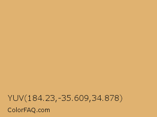 YUV 184.23,-35.609,34.878 Color is a light orange color and the nearest color is Harvest Gold #e0b974. Hex code #e0b270 and RGB value is rgb(224,178,112). In RGB color space, this color is composed of 88% red, 70% green, 44% blue, In CMYK color space, this color is composed of 0% cyan, 21% magenta, 50% yellow , 12% black , In HSL color space, this color has a hue angle of 35° , 64% saturation and 66% lightness.