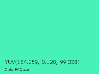 YUV 184.259,-0.128,-99.328 Color is a light green color and the nearest color is Turquoise #40e0d0. Hex code #47f2b8 and RGB value is rgb(71,242,184). In RGB color space, this color is composed of 28% red, 95% green, 72% blue, In CMYK color space, this color is composed of 71% cyan, 0% magenta, 24% yellow , 5% black , In HSL color space, this color has a hue angle of 160° , 87% saturation and 61% lightness.