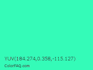YUV 184.274,0.358,-115.127 Color is a normal green color and the nearest color is Turquoise #40e0d0. Hex code #35fbb9 and RGB value is rgb(53,251,185). In RGB color space, this color is composed of 21% red, 98% green, 73% blue, In CMYK color space, this color is composed of 79% cyan, 0% magenta, 26% yellow , 2% black , In HSL color space, this color has a hue angle of 160° , 96% saturation and 60% lightness.