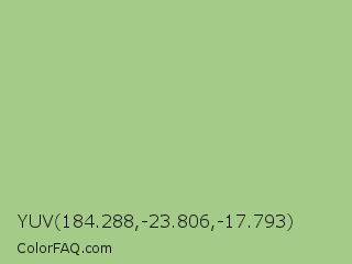 YUV 184.288,-23.806,-17.793 Color is a light green color and the nearest color is Feijoa #9fdd8c. Hex code #a4cc88 and RGB value is rgb(164,204,136). In RGB color space, this color is composed of 64% red, 80% green, 53% blue, In CMYK color space, this color is composed of 20% cyan, 0% magenta, 33% yellow , 20% black , In HSL color space, this color has a hue angle of 95° , 40% saturation and 67% lightness.
