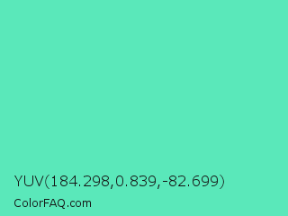 YUV 184.298,0.839,-82.699 Color is a light green color and the nearest color is Medium Aquamarine #66ddaa. Hex code #5ae8ba and RGB value is rgb(90,232,186). In RGB color space, this color is composed of 35% red, 91% green, 73% blue, In CMYK color space, this color is composed of 61% cyan, 0% magenta, 20% yellow , 9% black , In HSL color space, this color has a hue angle of 161° , 76% saturation and 63% lightness.